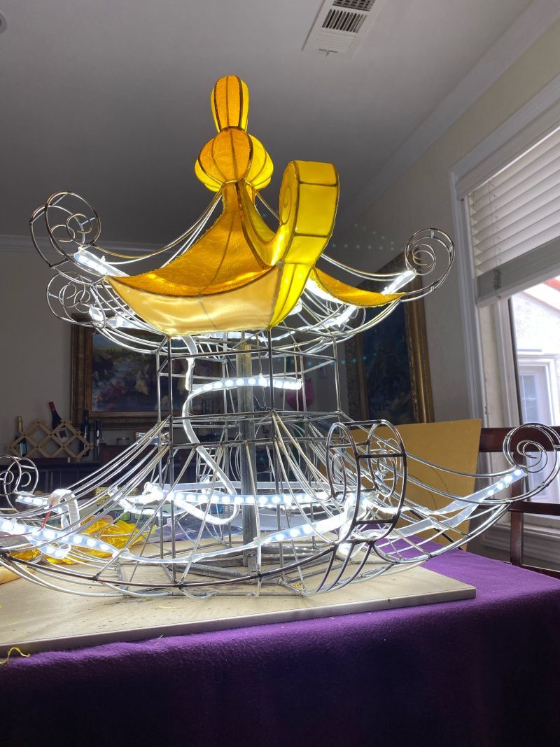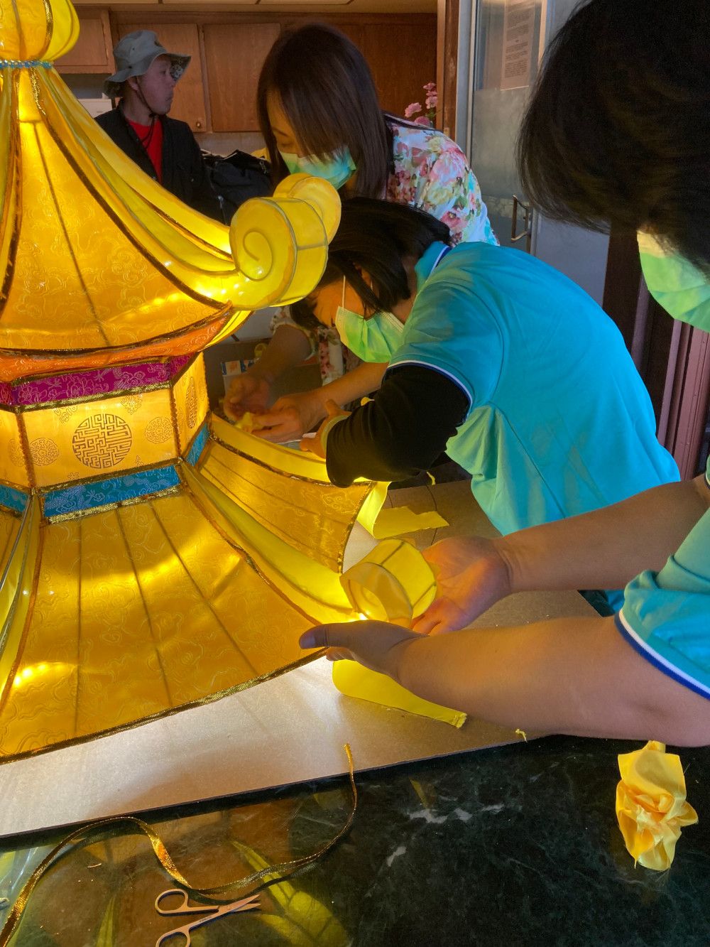 真不可思議啊!因著王怡師姐即興提出供奉彩燈之心意,竟然幾位志工一拍即合地就共同投入創造出了七月供燈會的彩燈!當然,畢竟只有王師姐一個人日以繼夜地在大太陽下,身著沈重無比的焊工袍,頭頂著厚重的保護頭盔,投入了打樣、造鋼骨架、焊接的工作,原來竟然是如此的大工程,令人瞠目結舌!眼見時間急迫,大家趕緊競競業業地學習參與裱布工作,眼看著一個鋼骨架蛻變成華麗莊嚴無比的彩燈在我們手上呈現出來,那樣的興奮真是無以言喻!歡迎大家到彩燈工作組的園遊攤位來一睹奇妙的彩燈製作!