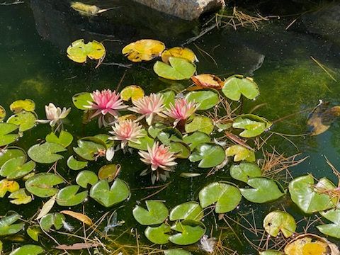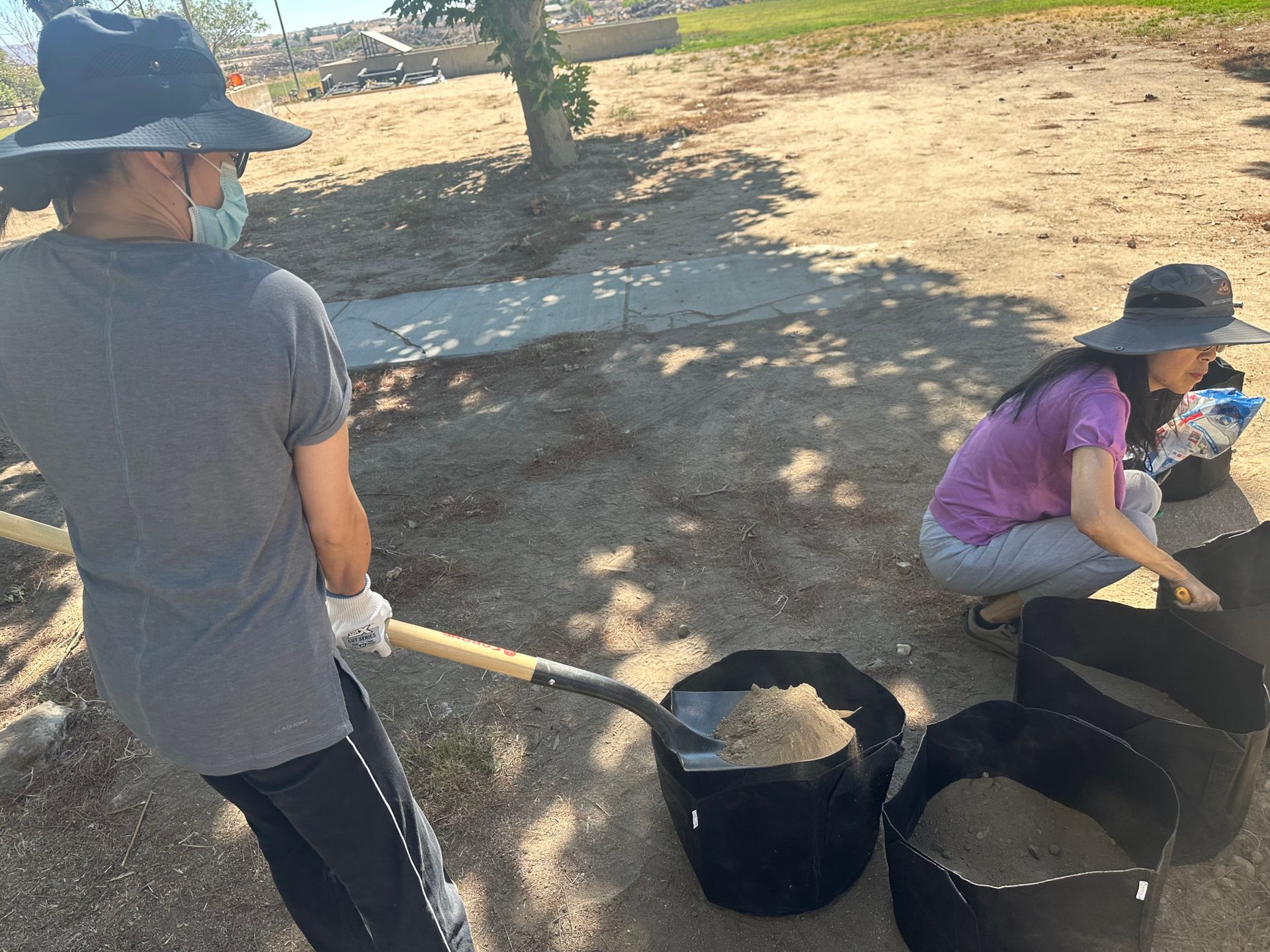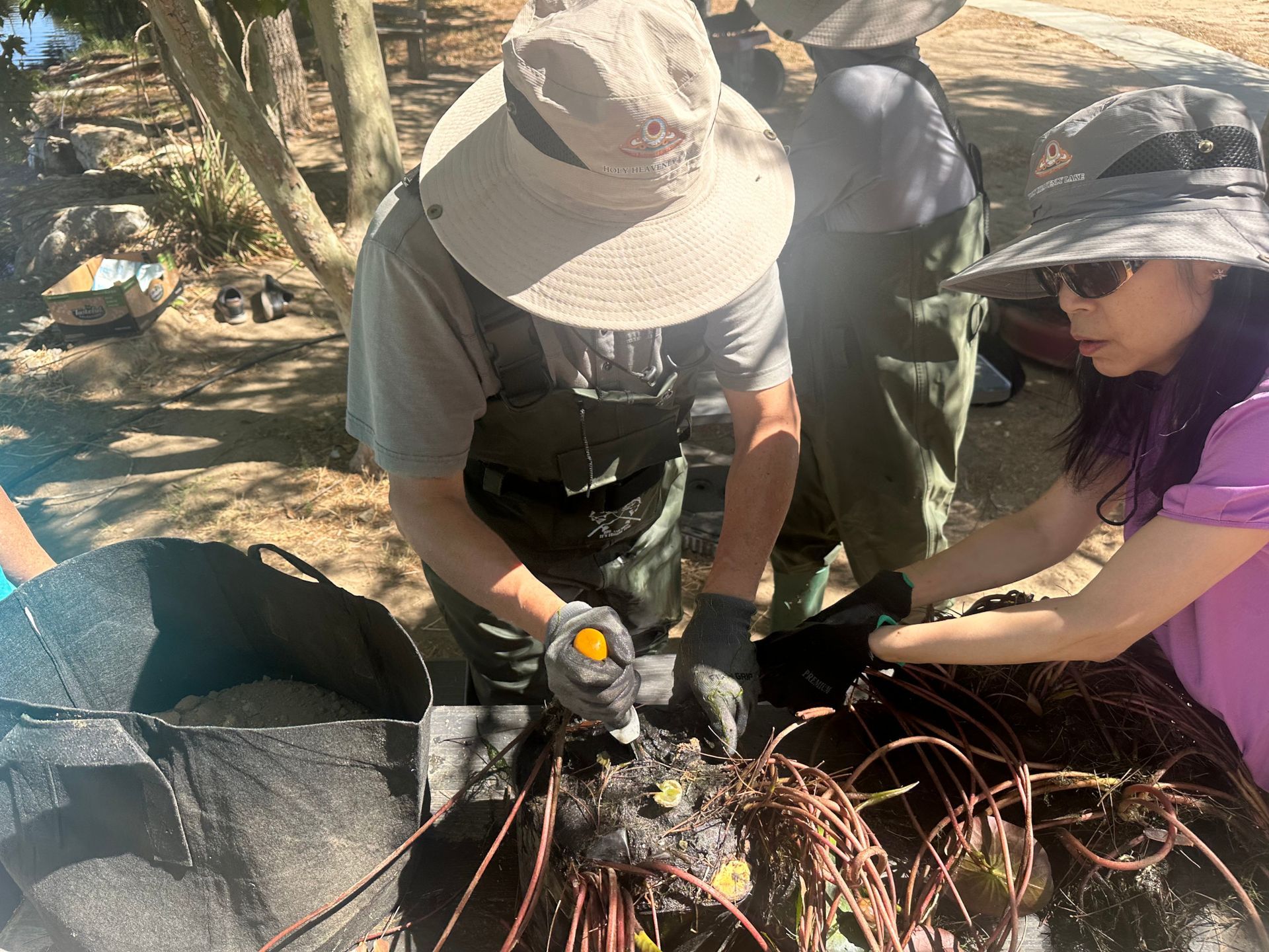 蓮花池的蓮花栽種幾經過去數年波折,每每發出新芽就成為鴨鳥鵝群的饗宴大餐,令人不勝唏噓!從去年起,改變策略先改種在岸邊,打算待其茁壯成長後再慢慢移往湖心。果然不出所望,岸邊蓮花今夏繁衍茂盛。8月18日我們進行了蓮花分株工作,幾乎加倍了數量,參與的志工都興奮不已。其實工作並不難,掌握了關鍵因素就能輕鬆上手。首先要選用黏土,在水中才不會流散,能充分提供蓮根養分。第二要用10加侖軟性的不織布盆(利於根部繁衍),將混合了肥料的黏土倒入。第三,把現有池中的蓮花盆取出,倒出來,將一盆中已發成多株的根,按株將根部切開成為2-3株,種入新盆。最後,將新盆安置回2-3呎深之淺水處。這就成功啦!靜待明夏再進行同樣動作,蓮花池就是這樣一點點成形地呀!明年打算提早在六月分株,應該能有更好的成效!