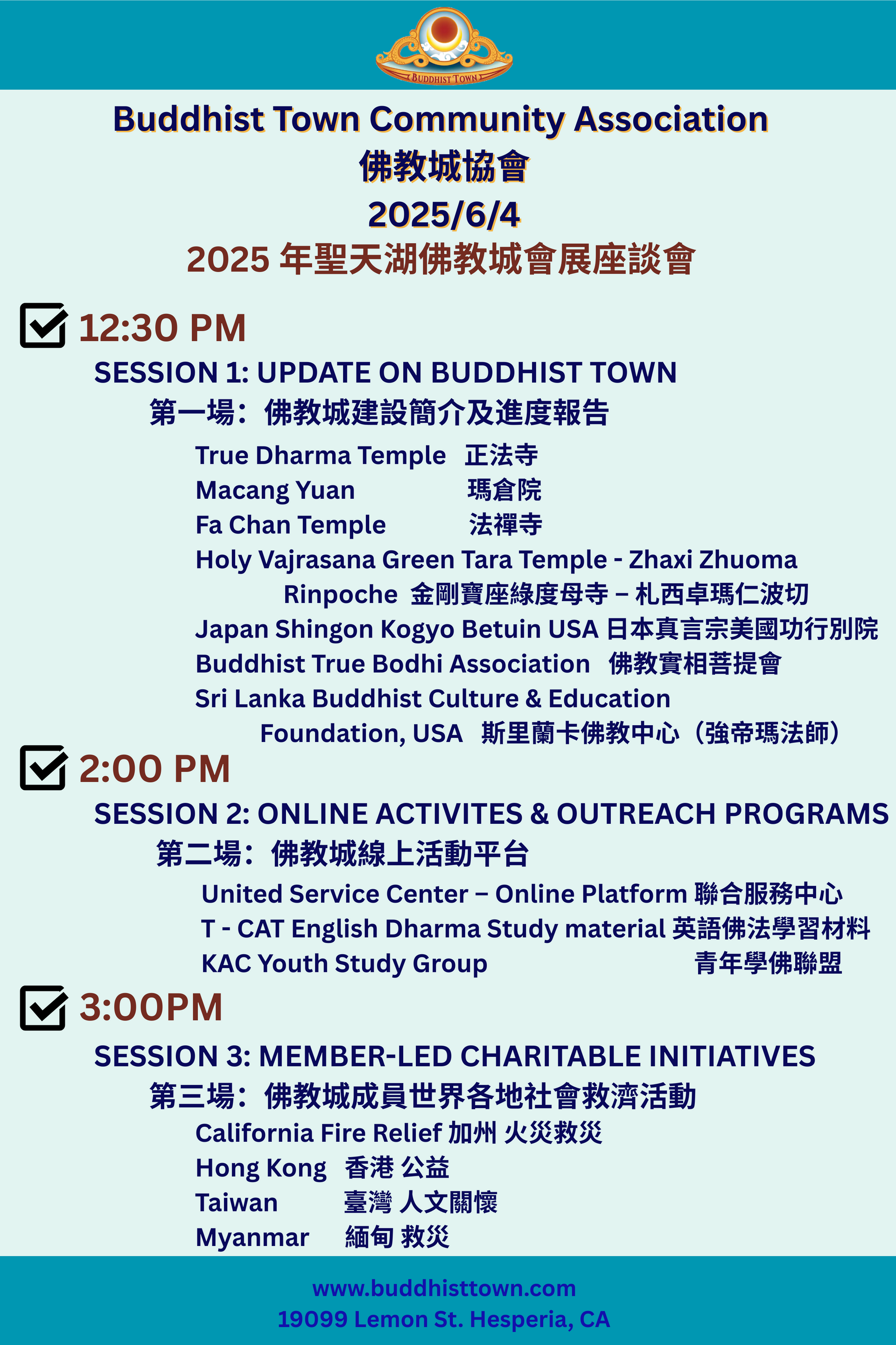 今年佛教城活動當日邀請了市長和市議員參加,及主建築師與地方人士。今年除了第一期建設設計圖展出外,第二期的諸多設計也將邀請參加展出,大家有機會觀摩交流。6/3日傍晚舉辦第一次戶外禪修會。 6/4日早上高智爾球友誼賽及文化會展活動,園遊會,下午舉辦三場座談會,特別邀請世界佛教總部,法禪寺,瑪倉院第一期佛教城協會成員參加,4:30 施放祈願蓮花燈,祈願世界和平。6/5日參訪金剛寶座寺,6/6日參訪瑪倉寺,華藏寺,及參觀美國國際藝術館,期盼我們的再相聚!